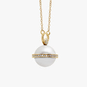 The necklace features a radiant natural pearl encircled by a diamond-studded ring, reminiscent of a planet. It's an example of...