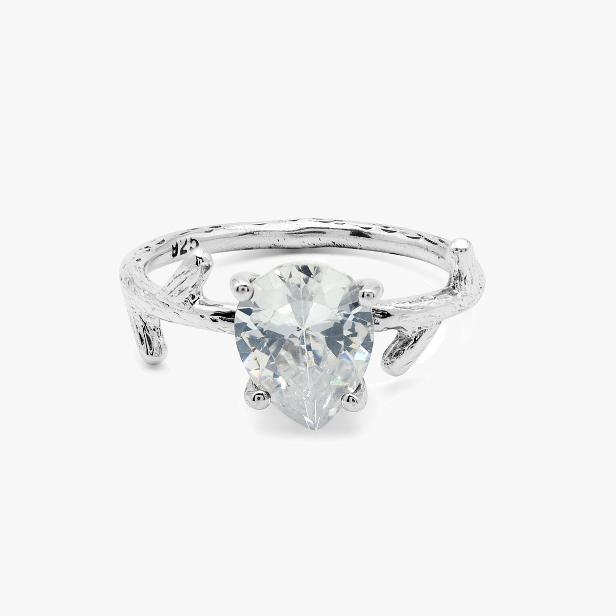 The ring band features intricate tree-like textures that wrap around the finger, creating a natural, organic feel. The delicate, twisting...